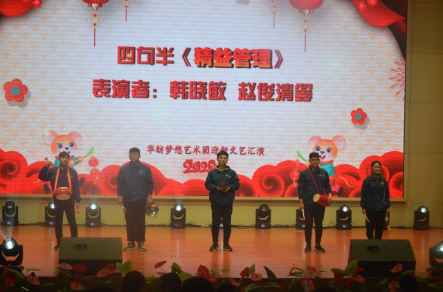 1月4日,繼公司舉行持續(xù)深化精益生產(chǎn)年度總結(jié)動員大會之后,精彩紛呈的“同心筑夢·贏戰(zhàn)2020——華紡夢想藝術(shù)團(tuán)迎新文藝匯演”與廣大員工見面。整場文藝匯演洋溢著吉祥喜慶的氣氛,充盈著昂揚(yáng)向上的旋律,展現(xiàn)出華紡人樂觀、奮進(jìn)的精神風(fēng)貌。