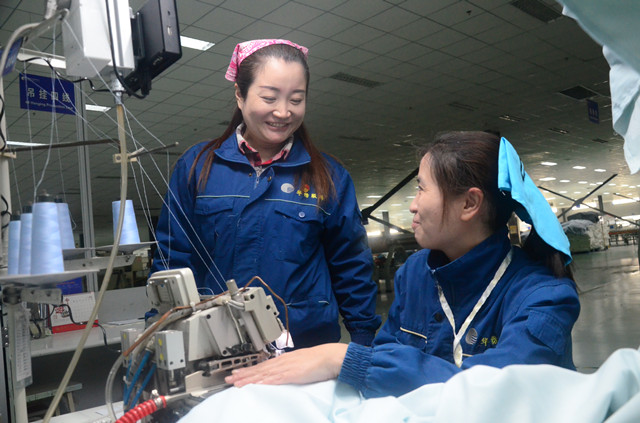 圖為姚俊燕(左)在與五線縫紉工王冬梅交流新貨單操作要點(diǎn)