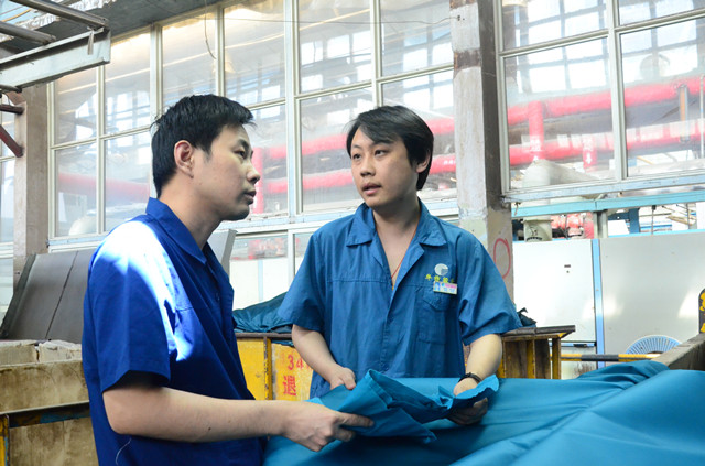 圖為公司家紡車間的趙山松(右)和韓延衛(wèi)(左)在對比優(yōu)化工藝后的下機(jī)產(chǎn)品。