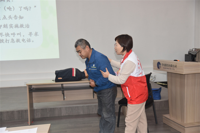 培訓(xùn)課上,王燕老師首先介紹了紅十字運(yùn)動(dòng)的基本知識,隨后重點(diǎn)針對日常生活中較為常見的意外事故,向在場員工詳細(xì)講解,并演示了創(chuàng)傷救護(hù)、氣道異物梗阻急救、海姆立克急救法、心肺復(fù)蘇及包扎固定等急救技能和相關(guān)知識。