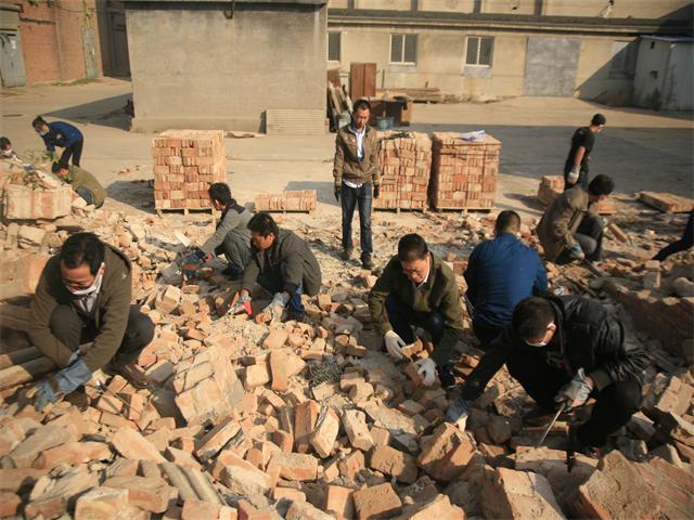 導(dǎo)讀:從10月10日開始,各主體車間及職能部室的部分員工下了班兒,相互約著來到現(xiàn)公司所屬的原經(jīng)編廠廠區(qū),對(duì)部分拆除后的房屋出現(xiàn)的紅磚進(jìn)行整理,以便再利用。