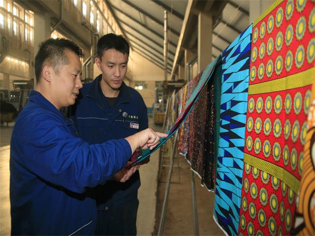 11月23日,在公司花二車間的生產現(xiàn)場,工程師田道國(左)與印制乙班班長寧方乾(右)來到“疵布展示區(qū)”,就最近兩天印花產品的質量情況進行交流與討論。