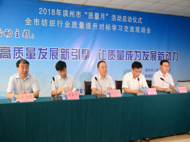 9月5日,2018年濱州市“質(zhì)量月”活動啟動儀式暨全市紡織行業(yè)質(zhì)量提升對標學習交流現(xiàn)場會在公司科技產(chǎn)業(yè)園舉行,會議由市政府秘書長尹月林主持,副市長、公安局長趙永生,市質(zhì)監(jiān)局黨委書記商新生,濱城區(qū)副區(qū)長鄭同忠,公司黨委書記、董事長王力民出席啟動儀式。